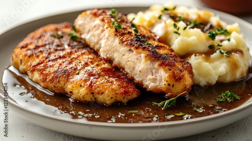 Deliciously plated crispy chicken fillet with creamy mashed potatoes and gravy