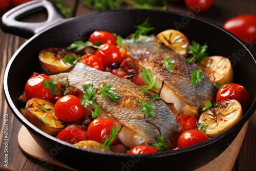 Deliciously seasoned and expertly roasted fish fillet in a sizzling pan, ready to be savored