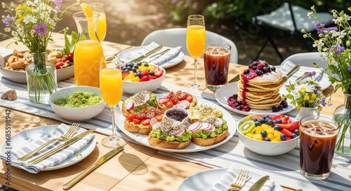 Delightful brunch outdoor feast with fresh fruits, toasts, and beverages