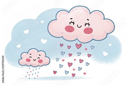 Delightful clouds spread love through heart-shaped raindrops in a whimsical illustration filled with joy and cheer. Generative AI