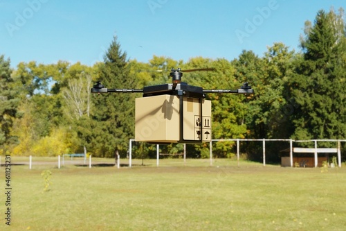 Delivery flying air drone in farm house. Business technology transportation and agriculture concept. Online shopping and service for customer house. 3D illustration rendering