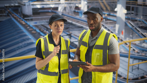 Delivery Station Warehouse Associates Having a Conversation at a Modern Logistics Center. Workers Using Tablet to Manage the Automated Conveyor Belt Load, Prepare Online Shopping Orders for Delivery