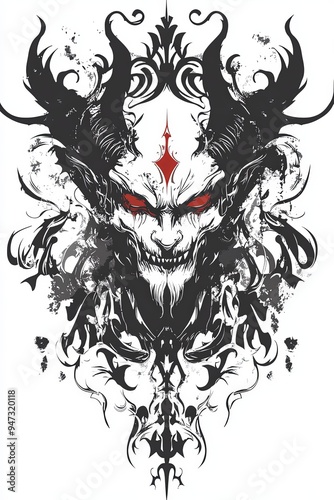 Demon Face Illustration with Grunge Texture and Floral Design