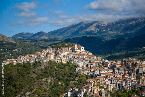 Dense arrangement of traditional stone houses with terracotta roofs in Rivello, Italy, set on a sunlit hillside with lush greenery and rugged mountains under a partly cloudy sky.