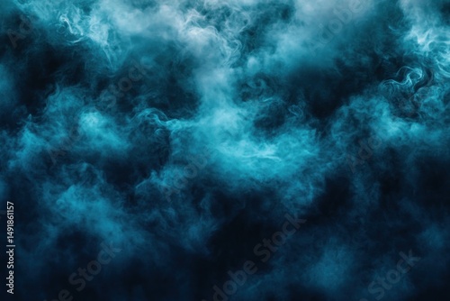 Dense blue and black smoke or mist swirling in an abstract pattern with varying shades and textures conveying a mysterious and ethereal atmosphere