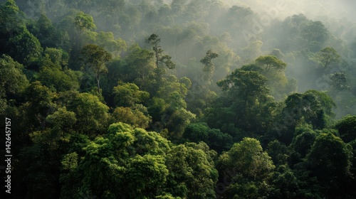 Dense Forest Shrouded in Mist with Sunlight Filtering Through Trees.
