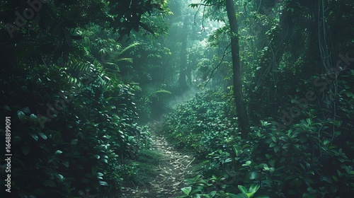 Dense Jungle Path Winding Through Tall Trees and Lush Vegetation, Concept of Nature Exploration, Adventure in the Wilderness, Tropical Forest Serenity