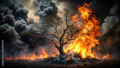 Dense smoke billowing from a forest fire on a dark and mysterious black background with twisted tree branches