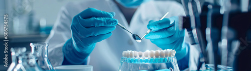 Dental assistant carefully mixing and preparing materials for upcoming crown installation alongside concentrated dentist preparing tools