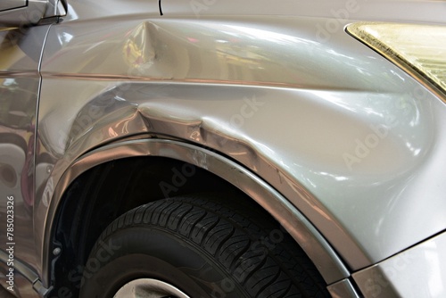 dented on car front fender crash by motorcycle.