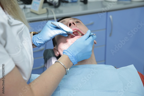 dentist with a patient in dental clinic. Concept of treatment and care of teeth and oral cavity.
