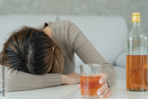 Depressed young Asian woman addicted feeling bad drinking whiskey alone at home, stressed frustrated lonely drinking alcohol suffers from problematic liquor, alcoholism, life and family problems