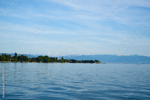 Der Bodensee mit Segelbooten und Bergen im Hintergrund