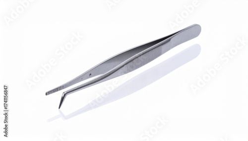 Describe metallic precision tweezers with pointed tips and textured grip, placed on a reflective surface. Highlight their sleek design, fine control, and relevance to beauty, medical, or tech use.