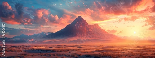 Desert landscape with a mountain at sunset. Dramatic lighting, serene atmosphere.