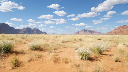 Desert landscape with mountains and wildflowers. Sunny day. Possible use Stock photo