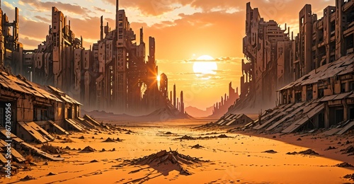 desert sci-fi cyberpunk city at sunset. futuristic dystopian town buildings and tall towers on the horizon. abandoned ghost town.