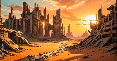 desert sci-fi cyberpunk city at sunset. futuristic dystopian town buildings and tall towers on the horizon. abandoned ghost town.