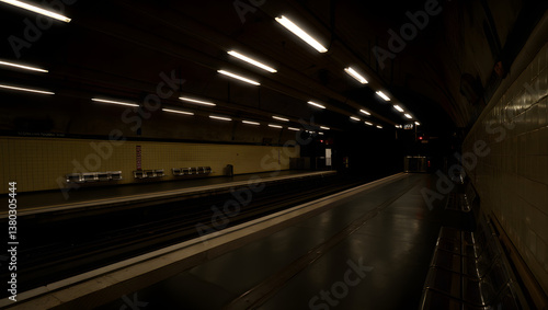 Deserted subway station in darkness with dim lighting, reflecting post-apocalyptic environment