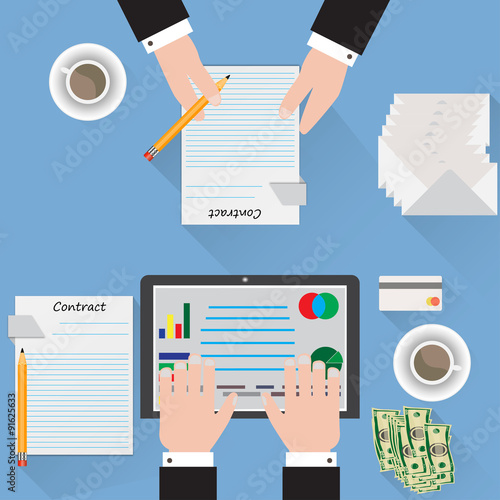 Desk signing a contract analyst blue background