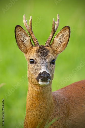 Detail of head of curious roe deer, capreouls capreolus, buck in wild. Close-up of deer in summer. Portrait of wild animal in nature.