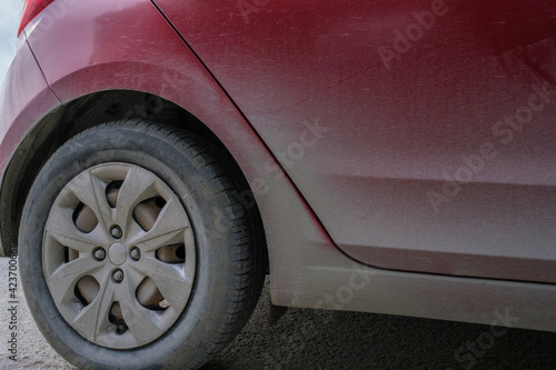 detail of right back wheels of red car automobile in dust and dirt on sides before cleaning and washing