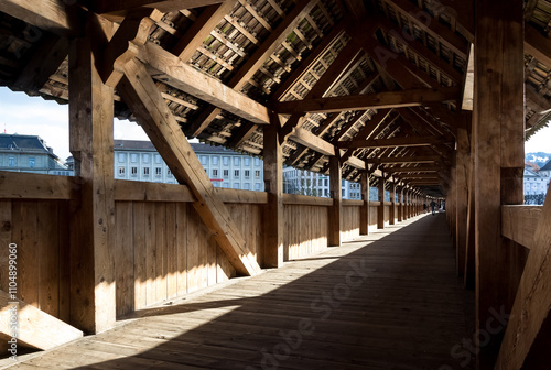 Detail of the Kapellbrücke (Chapel Bridge), a historic covered wooden footbridge and major landmark spanning the Reuss River in the city of Lucerne, Switzerland.