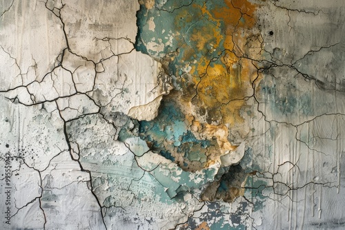 Detail of weathered paint peeling off a textured surface in vibrant red and teal colors, showcasing layers and cracks, reflecting years of exposure and neglect