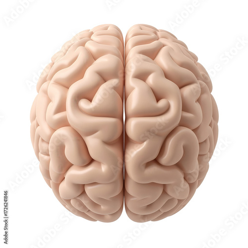 Detailed anatomical illustration of a human brain, presented in a light peach hue against a black backdrop.