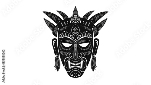Detailed black and white tribal mask with decorative elements isolated on white background