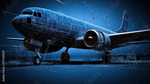 Detailed blueprint of a vintage aircraft against a dark blue background with construction elements