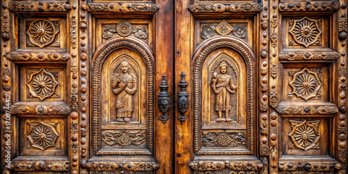 Detailed carvings depict historical figures and floral patterns on these large wooden doors, showcasing exquisite craftsmanship and cultural artistry from a specific location