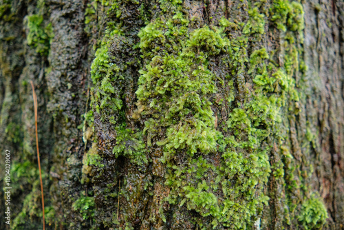detailed close-up of fresh green moss growing on the textured bark of a pine tree after rain. The moisture enhances the vibrant colors and natural patterns, creating a rich and organic forest scene.