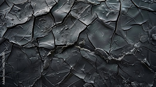Detailed cracked black mud, dried and parched earth, abstract texture, dark background, unique and visually captivating
