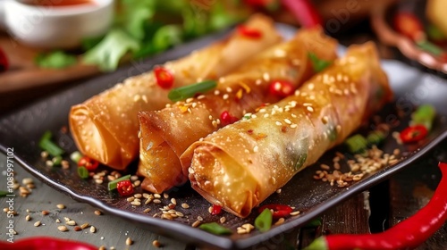 Detailed Focus on Crispy Spring Rolls Filled with Veggies and Shrimp