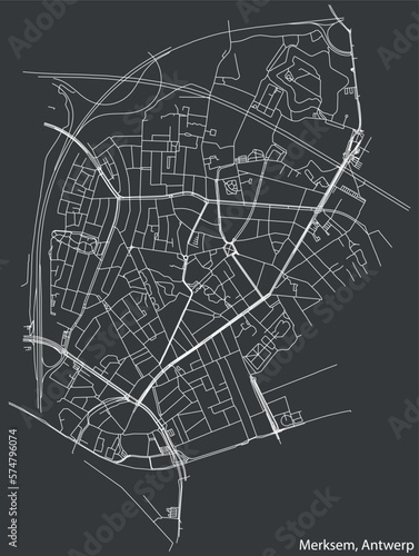 Detailed hand-drawn navigational urban street roads map of the MERKSEM DISTRICT, ANTWERP Belgium with vivid road lines and name tag on solid background