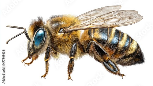 Detailed illustration of a bee showcasing intricate features, highlighting the delicate wings, vibrant colors, and realistic textures of this important insect species