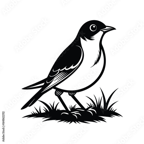 Detailed line art illustration of an american robin bird in mid hop across a grassy field on a white background