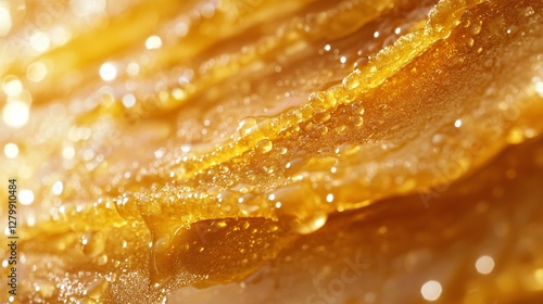 Detailed macro photograph of golden honey with droplets of water