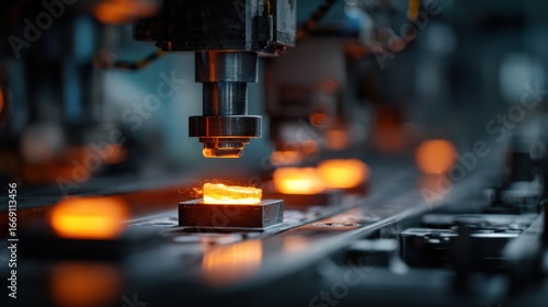 Detailed medium shot of a hightech aluminumfoam crashbox production line centered on a glowing extruder nozzle producing lightweight safety zones with surroundings gently out of