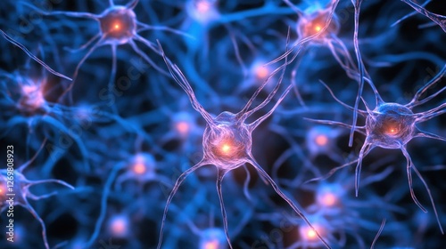 Detailed Microscopic View of Neurons with Vibrant Blue and Orange Lighting
