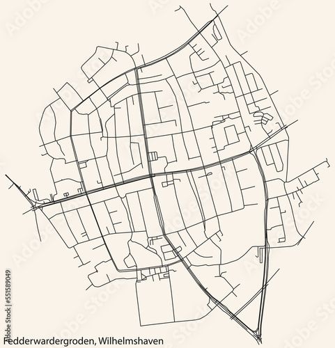 Detailed navigation black lines urban street roads map of the FEDDERWARDERGRODEN DISTRICT of the German town of WILHELMSHAVEN, Germany on vintage beige background