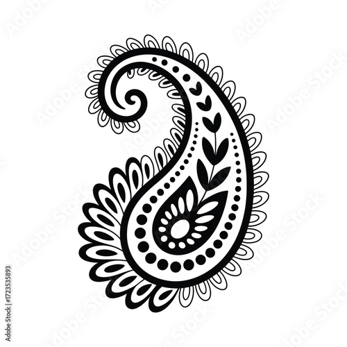 Detailed paisley outline design featuring leaves, dots, and scrolls for diverse graphic and textile applications