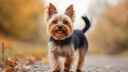 Detailed shot of a small, cute dog with a wagging tail and perky ears, set against a soft, blurred background to highlight its cuteness.