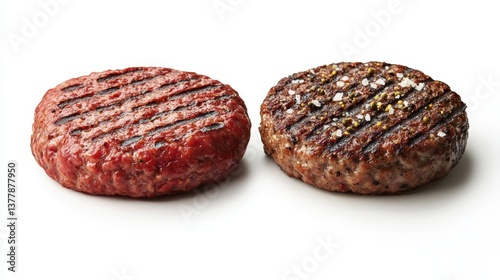 Detailed Side By Side Comparison of Fresh Raw and Grilled Hamburger Patties for Culinary Evaluation