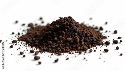 Detailed studio shot showcasing a pile of fertile garden soil, scattered artfully on a pristine surface, with a focus on texture and earthy richness