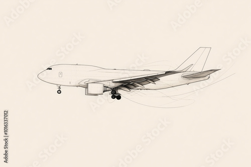 Detailed technical drawing of a commercial airplane in flight with its landing gear extended, showcasing aerodynamic lines and aircraft structural components.