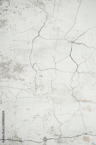 Detailed texture of an old white cracked wall with visible weathering. The rough plaster surface shows a grunge background with abstract fissure patterns