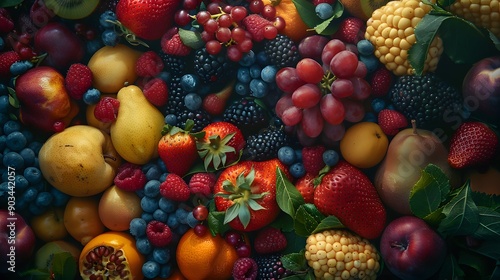Detailed top view of a variety of fresh fruits, highlighting their natural colors and textures.