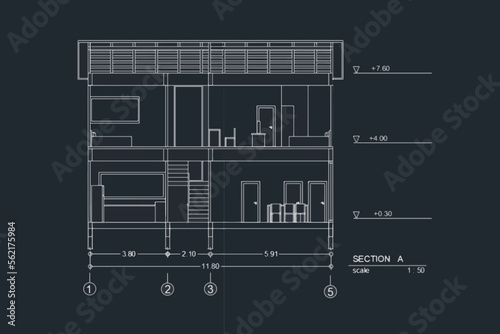 Detailed townhouse section, floor plans, apartments layout. Vector blueprint for architectural vector